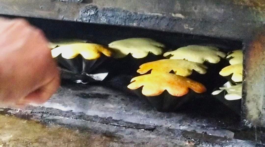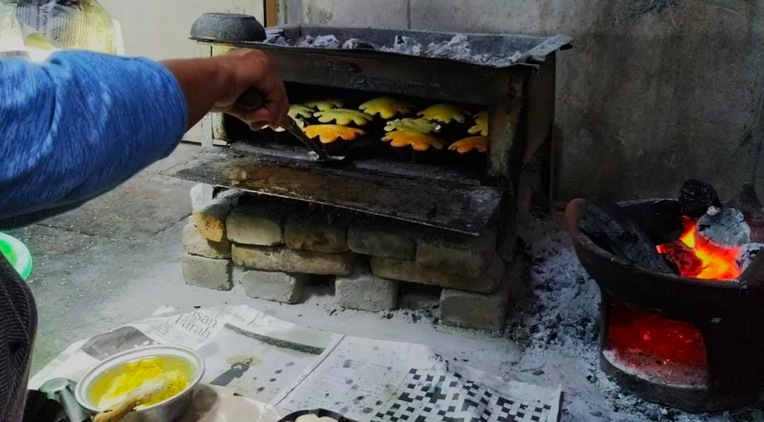 When the coals are big enough to light, a medium-sized oven is immediately placed on the stove. The top of the oven is also given charcoal that spreads the heat evenly. Then, dozens of aluminum molds shaped like hibiscus leaves are smeared with butter and prepared on a tray. When the dough is ready, the molds are filled with dough, then put in the oven alternately.